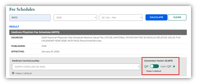 MPFS example: On the Fee Schedules page, select QP or non-QP after you enter the code, year, and quarter. The conversion factor is displayed above the toggle, and the option to make your selection the default is under the toggle.