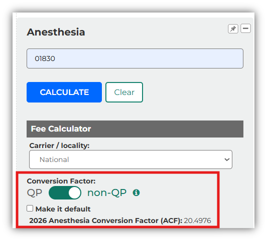 Anesthesia example: Subscribers to Codify by AAPC’s anesthesia add-on will see the anesthesia conversion factor options. For instance, in the Anesthesia widget, you can select QP or non-QP, choose which one to make default, and view the conversion factor based on your choices.