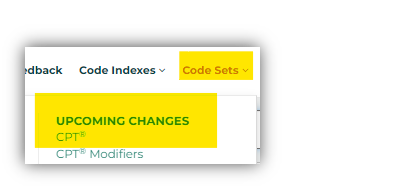 To view the changes, select Code Sets/Upcoming Changes/CPT® in the top menu. When the page opens, choose a category such as New or Revised to view changes.